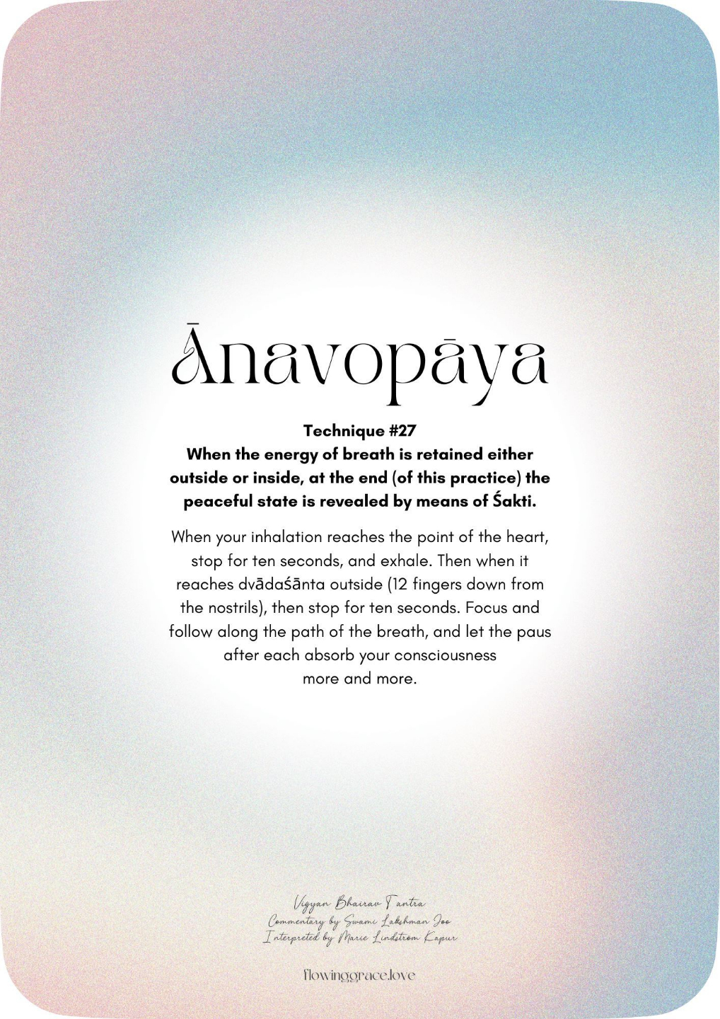 The Āṇavopāya techniques are employing physical and mental activities like concentration type meditation techniques, mantra and ritual, to gradually elevate the practitioner’s consciousness by focusing on an object such as breath, body or sensation.