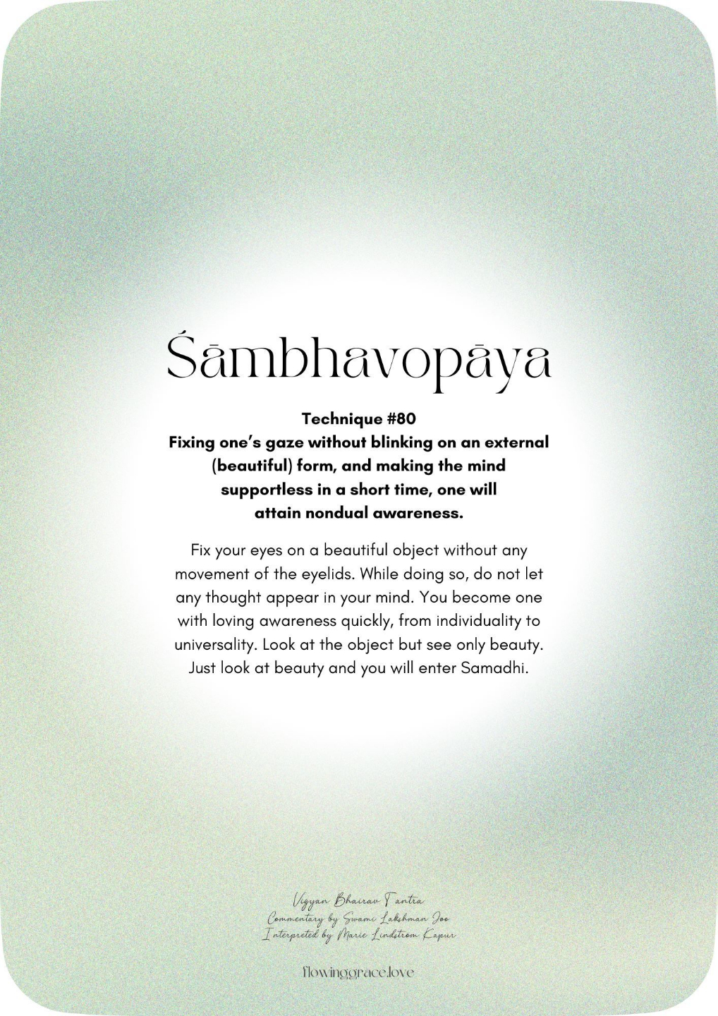 Fixing oneās gaze without blinking on an external (beautiful) form, and making the mind supportless in a short time, one will attain nondual awareness.