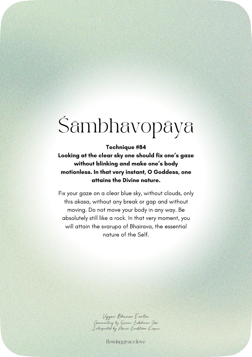 Looking at the clear sky one should fix oneās gaze without blinking and make oneās body motionless. In that very instant, O Goddess, one attains the Divine nature.