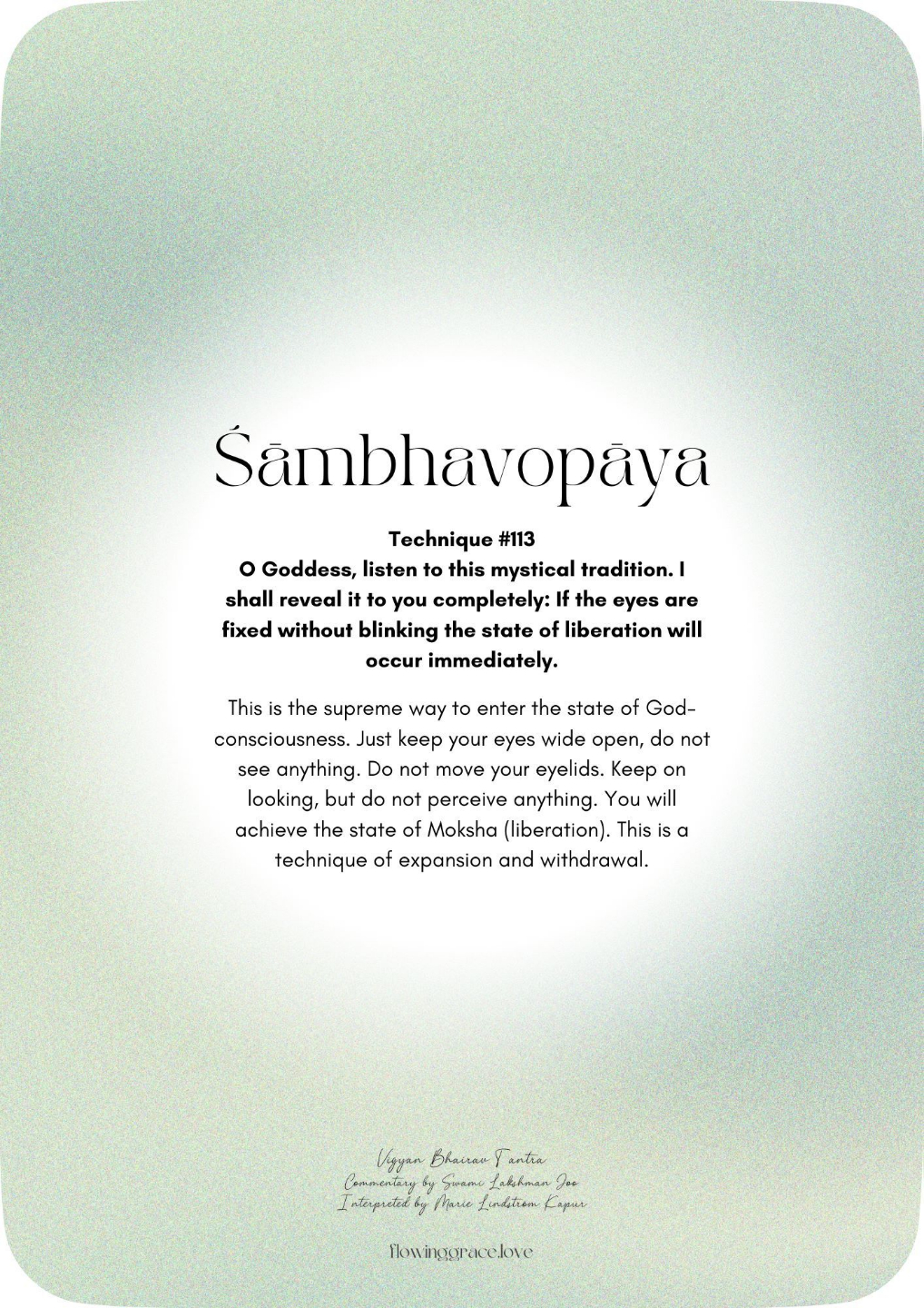 O Goddess, listen to this mystical tradition. I shall reveal it to you completely: If the eyes are fixed without blinking the state of liberation will occur immediately.